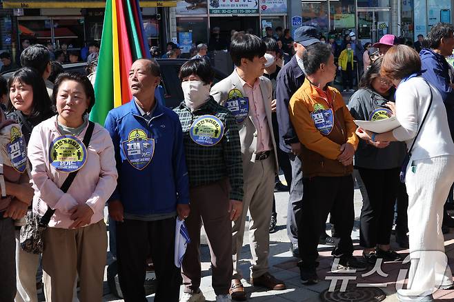 (진안=뉴스1) 안은나 기자 = 7일 오전 전북 진안군 진무로에서 이재명 더불어민주당 대통령 후보 지지자들이 '이재명'과 '보디가드'라는 단어를 조합한 '잼가드' 스티커를 몸에 부착하고 있다. 2025.5.7/뉴스1