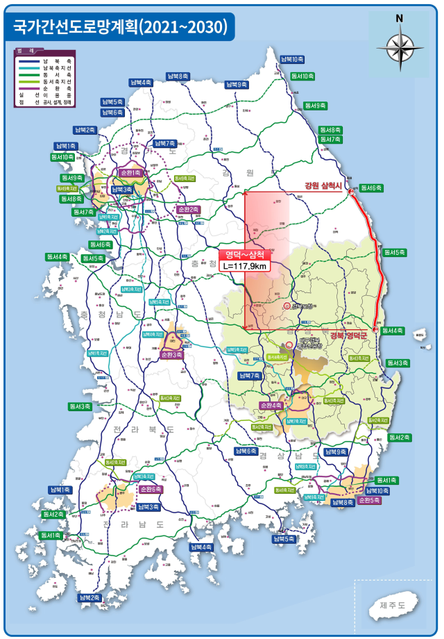 전 구간을 신규로 건설해야 하는 남북 9축 고속도로와 달리, 남북 10축 고속도로(동해안 고속도로)는 단절 구간(영덕~강원 삼척, 117.9㎞)의 연결만 이뤄지면 가능하다. 현재 동해안 고속도로는 부산~포항(100.9㎞) 구간과 강원 삼척~속초(122.6㎞) 구간이 단절된 상태다. 포항~영덕(49.2㎞) 구간의 경우엔 영일만횡단대교 건설(18.1㎞)에 더해 나머지 구간(포항 흥해~영덕 강구 31.1㎞)은 올 연말 개통을 목표로 공사에 한창이다.