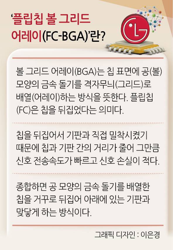 그 중 FC-BGA는 이름부터 복잡한데 뜯어보면 ‘볼 그리드 어레이(BGA)’는 칩 표면에 공(볼) 모양의 금속 돌기를 격자무늬(그리드)로 배열(어레이)하는 방식을 뜻한다. ‘뒤집다’라는 뜻을 가진 플립(flip)에서 알 수 있듯 플립칩(FC)은 말 그대로 칩을 뒤집었다는 의미다.