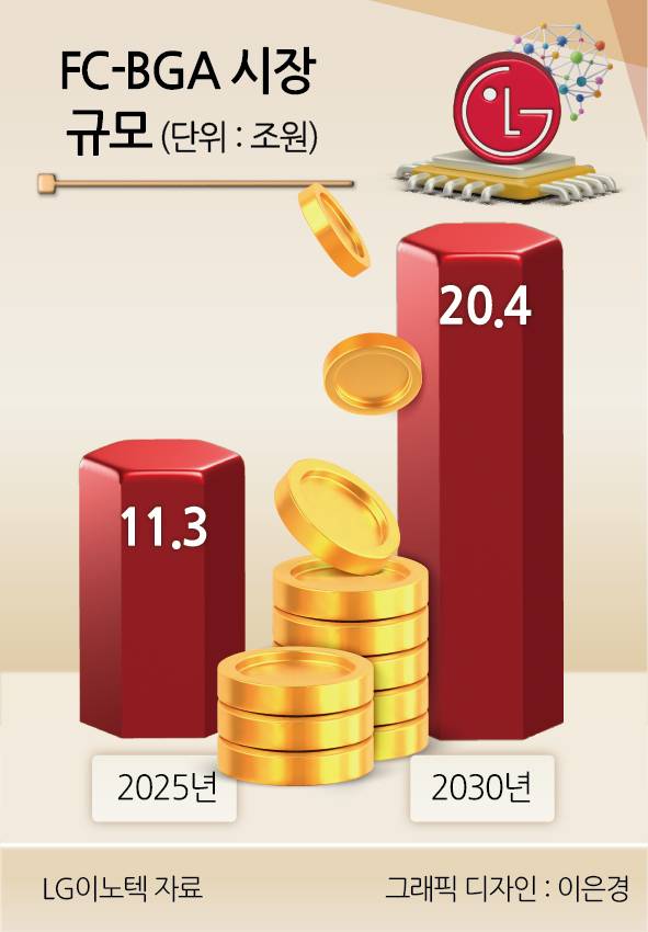 LG이노텍은 FC-BGA 시장 규모가 올해 11조3000억원에서 2030년 20조4000억원으로, 연평균 10.3%씩 성장할 것으로 내다보고 있다.