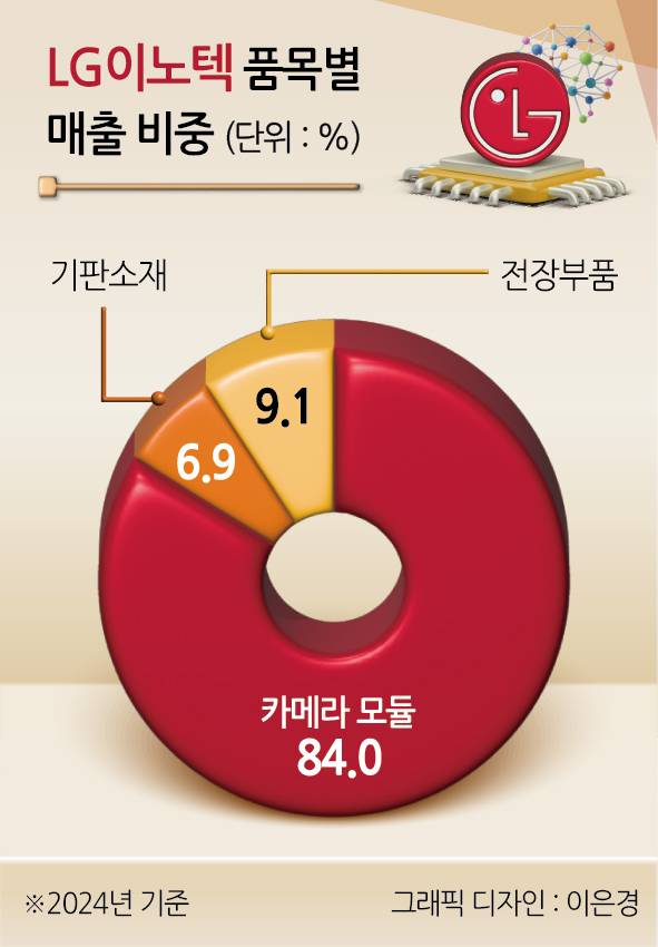 광학솔루션사업부 매출 의존도는 2022년 81.5%에서 2023년 83.9%, 2024년 84%로 매년 높아지고 있는 추세다. 애플 아이폰에 공급하는 카메라 모듈 사업 성적이 그 해 LG이노텍 전체 실적을 좌우할 만큼 절대적인 비중을 차지한다.