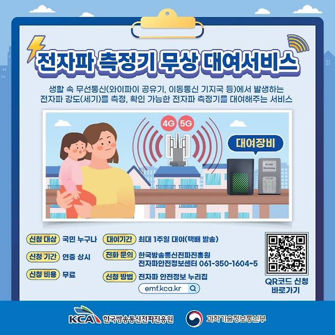 과학기술정보통신부와 KCA는 2022년부터 국민 누구나 이동통신 기지국(3G, 4G, 5G)과 실내 와이파이(WiFi) 공유기 등에서 방출되는 전자파를 직접 확인할 수 있도록 소형 전자파 측정기 대여 서비스를 공동 운영하고 있다. 지난 3년간 6000여 명이 이 서비스를 통해 전자파 안전성을 확인했다.
