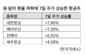 이날 원·달러 환율이 급격히 하락하자 원화 강세 수혜주인 항공주로 투자심리가 몰린 것으로 풀이된다. 항공기 대여, 항공유 등을 달러로 지불하는 항공사 특성상 환율이 하락하면 구매 비용이 줄어 수익성 향상에 일조하는 게 일반적이기 때문이다.