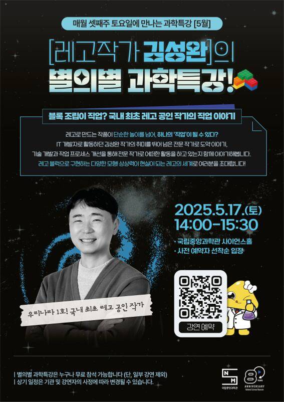 ■국립중앙과학관은 5월 '별의별 과학특강' 강사로 전세계 23명뿐인 레고 그룹 공식 인증 작가를 초청한다고 밝혔다.