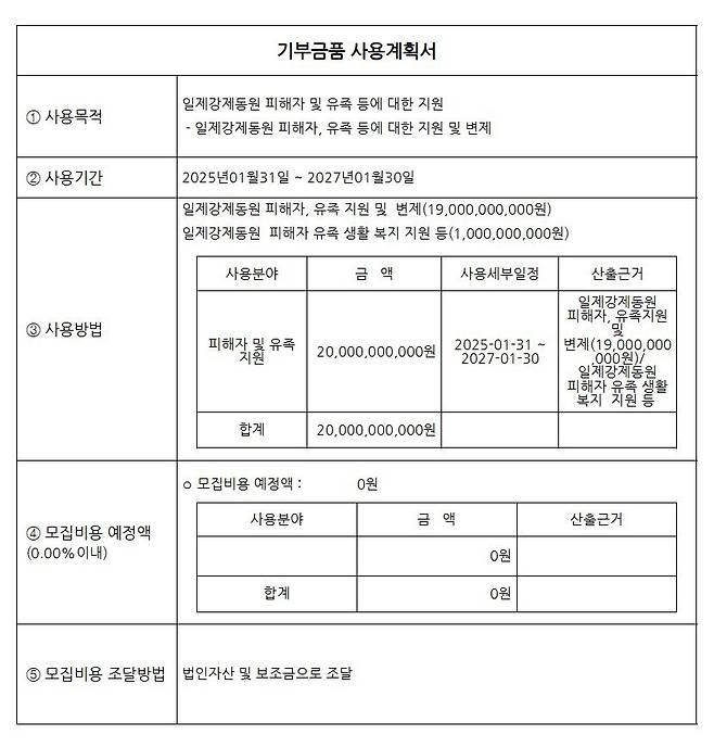 | ▲ 일제강제동원피해자지원재단의 기부금품 사용계획서. |