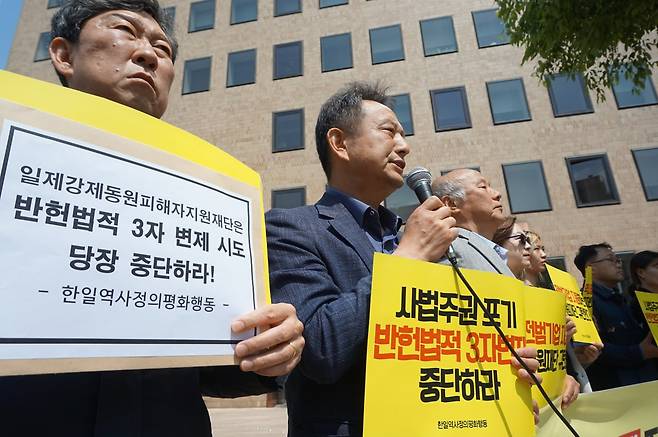한일역사정의평화행동이 7일 서울 일제강제동원피해자지원재단(지원재단) 앞에서 기자회견을 열고 "지원재단은 일본 전범 기업에 면죄부를 주는 제 3자 변제를 당장 중단하라"고 촉구했다.