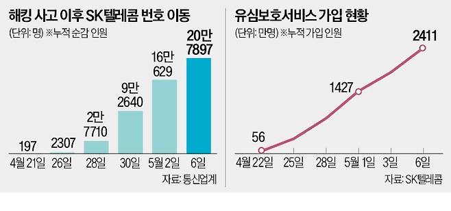 SK텔레콤은 이날 해외 로밍 서비스를 이용 중인 100만여 명을 제외한 가입자 2411만 명 전원이 유심보호서비스 가입을 완료했다고 밝혔다. SK텔레콤은 지난 2일부터 모든 가입자를 대상으로 유심보호서비스 자동 가입을 실시했다. 이 서비스에 가입하면 유심 교체 없이도 유심 불법 복제 등 추가 피해를 막을 수 있다는 게 SK텔레콤의 설명이다.