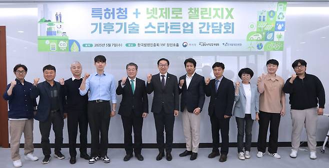 [서울=뉴시스] 홍효식 기자 = 김완기 특허청장(가운데)이 7일 서울 강남구 한국지식재산센터에서 열린 ‘특허청+넷제로 챌린지X 기후기술 스타트업 간담회’에서 참석자들과 기념촬영하고 있다. (사진=특허청 제공) 2025.05.07. photo@newsis.com *재판매 및 DB 금지