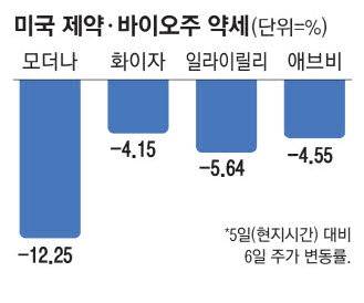 화이자(-4.15%), 애브비(-4.55%), 머크(-4.59%), 암젠(-3.43%) 등 대형 제약사(빅파마)도 이날 동반 약세를 보였다. 비만 치료제시장의 두 강자인 일라이릴리와 노보노디스크는 전날보다 각각 5.64%, 3.93% 떨어지며 장을 마감했다.