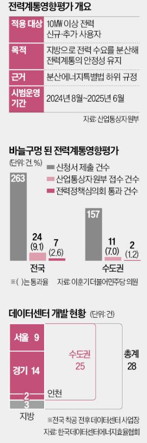 정작 데이터센터가 필요한 실수요 기업은 정부의 계통평가로 어려움을 겪고 있다. 분산에너지활성화특별법과 함께 등장한 계통평가가 지난해 8월 시범 운영에 들어간 이후 수도권에 대규모 전력시설을 짓는 것은 사실상 불가능해졌기 때문이다. 이훈기 더불어민주당 의원에 따르면 한국전력은 계통평가 시범 운영 기간에 263건의 신청을 접수했지만 산업부 심사를 통과한 사례는 지난달 초 기준 7건(2.7%)에 그쳤다. 이 중 수도권 신청 건수는 157건이며 단 2건(1.2%)만 통과됐다. 서울 지역 통과 사례는 전무했다.