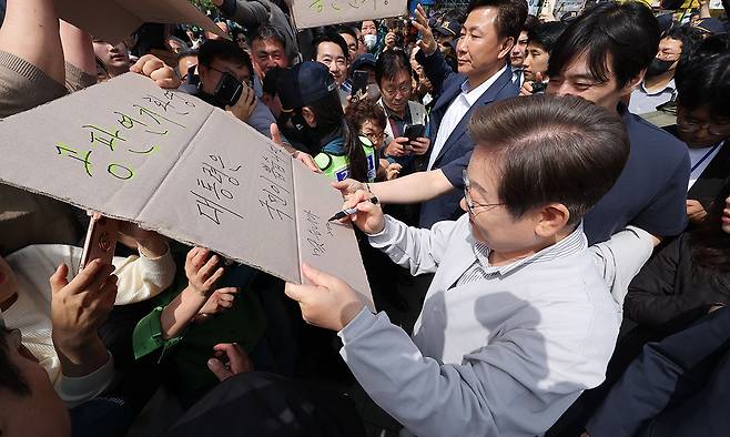 | 공판 연기 축하 팻말 받는 李 더불어민주당 이재명 대선 후보가 7일 전북 전주시 풍남문 앞 광장에서 지지자들에게 인사하다가 한 지지자가 든 파기환송심 공판 연기 축하 팻말에 사인하고 있다. 이날 서울고등법원은 15일로 예정됐던 이 후보의 공직선거법 위반 혐의 사건 파기환송심 첫 공판을 대선 뒤인 다음달 18일로 연기했다. 연합뉴스 |