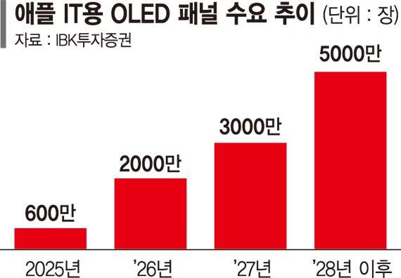 7일 증권가 및 업계에 따르면 디스플레이 업계 최대 수요처인 애플의 노트북, 태블릿 등 IT용 OLED 연간 수요는 올해 600만 장에 이어 △2026년 2000만 장 △2027년 3000만 장 △2028년 이후 5000만 장으로 늘어날 것으로 예상된다.