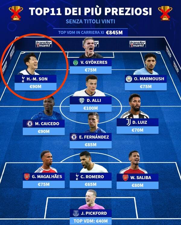 이탈리아 ‘트랜스퍼마크트’는 7일(한국시간) “독일 분데스리가 우승으로 해리 케인이 생애 첫 우승 트로피를 들어 올렸다. 이를 계기로, 커리어 동안 많은 득점을 올렸음에도 불구하고 유럽 5대 리그에서 아직 단 한 개의 우승 트로피도 차지하지 못한 가장 가치있는 선수 베스트11을 소개한다”고 전했다.