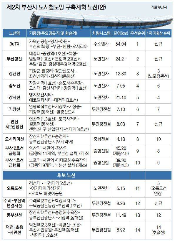 향후 10년간 부산의 대중교통 체계를 크게 바꿀 부산시 도시철도 구축계획의 밑그림이 나왔다. 가덕신공항과 부산시 주요 거점을 잇는 부산형 급행철도(BuTX)와 원도심과 북항재개발지구를 연결하는 부산항선을 비롯해 시가 선정한 10개 노선이 계획대로 추진된다면 부산의 전체 도시철도 규모는 지금의 배 가까이 늘어난다.