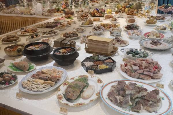 전시관 내부는 수십 년의 역사가 묻어나는 고풍스러운 도자기, 유럽식 식기와 명화 등으로 장식돼 있어 마치 왕궁의 연회장에 온 듯한 분위기를 자아낸다. 식탁에 깔린 새하얀 식탁보 위로는 전주비빔밥부터 고기, 빵, 초콜릿 등 산해진미를 쏙 빼닮은 돌이 전시돼 있다. 이는 모두 인공적으로 가공하지 않은 자연석으로, 한국 중국 브라질 아프리카 등 세계 각지에서 수집한 것이다.