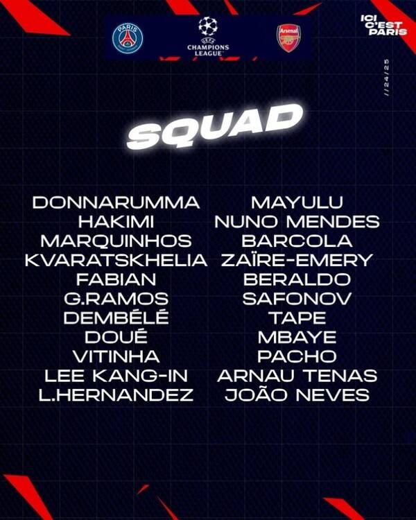 PSG는 아스널전에 나서는 출전 명단을 발표했는데, 이강인이 포함돼 있었다.