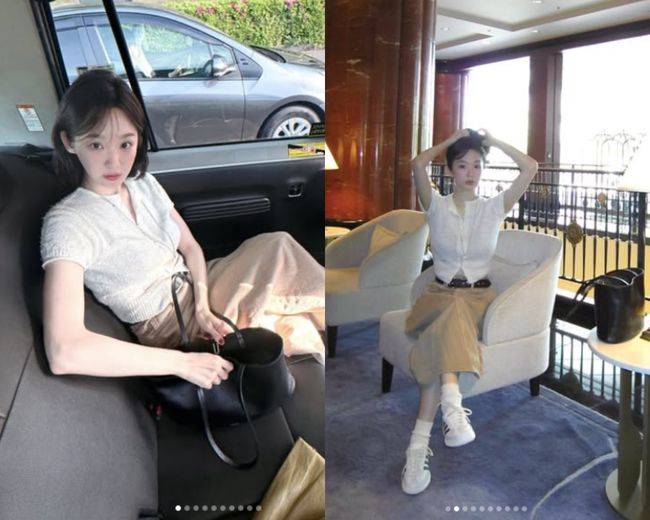 사진 속 강민경은 베이지 톤의 롱치마에 반팔 카디건을 입고 포즈를 취하고 있는 모습이 담겼다. 봄 분위기가 돋보이면서도 차분한 컬러로 매치한 강민경은 귀엽고 사랑스러운 매력을 물씬 풍겼다.