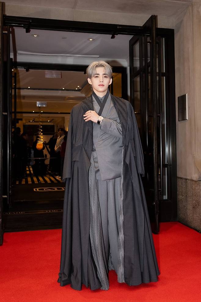 BOSS의 글로벌 앰배서더로서 레드카펫에 등장한 에스쿱스는 전통과 현대를 아우르는 독창적인 맞춤 룩으로 큰 주목을 받았다. 그의 의상은 한복 저고리에서 영감을 얻어 디자인된 이탈리아 그레이 울 플란넬 소재로 제작됐다.