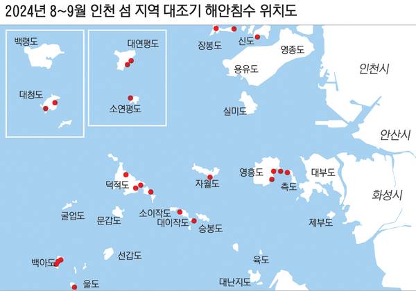 지난해 8월 백중사리 대조기 때 덕적도뿐만 아니라 신도, 장봉도, 백아도, 소야도, 선재도, 울도, 연평도, 소연평도, 대청도 등 인천의 여러 섬 지역에서 도로와 선착장, 물양장 침수가 광범위하게 발생했다. 심지어 육지와 다리로 연결된 영흥도 역시 진두항 인근 영흥파출소 앞 도로가 물에 잠겨 인근 상인들이 피해를 봤다. → 위치도 참조