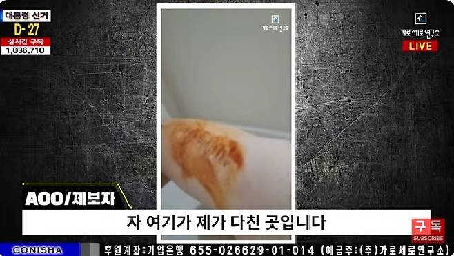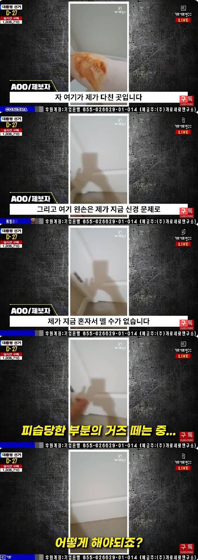 이어진 영상에서 제보자 A씨는 "왼손은 손을 쓸 수 없다. 오른쪽 어깨 쪽을 찍으려고 하면 손이 좀 떨린다. 이해해 주시고 사진을 찍어서 보내려고 했지만 개소리할까봐 아주 감사하다. 여기가 내가 다친 곳이다. 그리고 여기 왼손은 지금 신경 문제로 손가락에 감아져 있는 건 지금 혼자서 뗄 수 없다. 지혈이 안돼서 무슨 가루 같은 것도 넣고 이제 지혈이 좀 되고 있다"라고 말했다.
