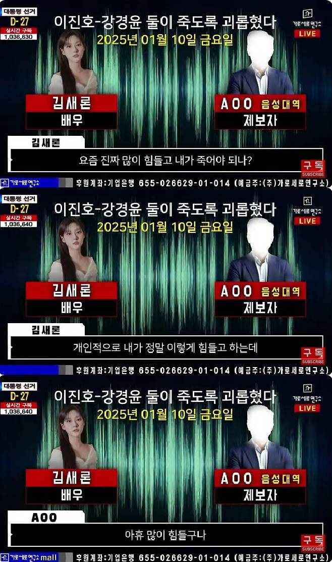 김새론은 자신의 힘든 심경을 고백했고 과호흡 증상도 보였다. 이 녹취록은 이날 가로세로연구소 김세의와 김새론 유족 측 법률대리인 법무법인 부유 부지석 변호사가 연 기자회견에서 공개된 바 있다.
