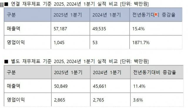 작년 동기대비 연결 기준 매출은 76억원(15.4%), 영업이익은 9.9억원(1871.7%) 증가했다. 별도 재무제표 기준으로는 전년 동기 대비 매출 52억원(11.4%), 영업이익 1억원(3.6%) 각각 늘었다.