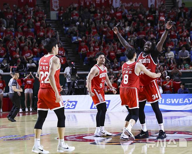 [서울=뉴시스] 김근수 기자 = 7일 잠실학생체육관에서 열린 2024-2025 KBL 챔피언결정전 창원 LG 대 서울 SK 경기, SK 자말 워니가 슛을 성공하고 동료들과 기뻐하고 있다. 2025.05.07. ks@newsis.com