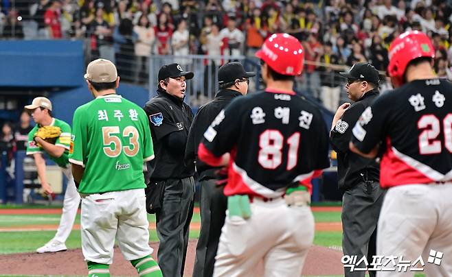 헤드샷 퇴장에 관해 논의하는 심판진[포토]