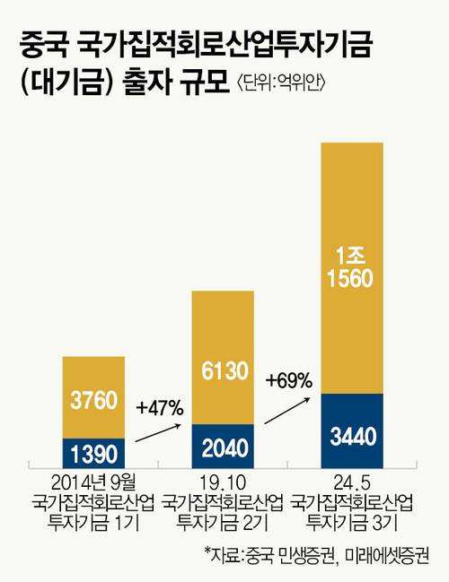 지난해 5월 중국 정부는 국가집적회로산업투자펀드(대기금) 3기 설립을 공식화했다. 총 지원 규모는 3440억위안(약 67조원)이다. 여기에 1조5000억위안(약 300조원) 규모 지원금이 추가 유입될 것으로 보인다. 앞선 1·2기 대기금 규모를 합친 것보다 많은 역대 최대 규모다. 1기 대기금은 5145억위안, 2기 대기금은 8166억위안이다. 중국 정부는 올해를 시작으로 향후 10년 동안 3기 대기금을 반도체 산업 등에 지원할 방침이다.