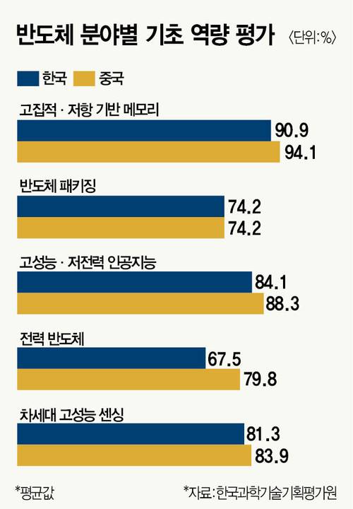 최고 기술 선도국을 100%로 봤을 때 고집적·저항 기반 메모리 기술 분야는 한국이 90.9%로 중국(94.1%)보다 낮은 2위다. 고성능·저전력 인공지능(AI) 반도체 기술도 한국이 84.1%로 중국(88.3%)보다 낮다. 전력 반도체 역시 한국이 67.5%, 중국이 79.8%로 차이가 크고, 차세대 고성능 센싱 기술은 한국이 81.3%, 중국이 83.9%다. 그나마 반도체 첨단 패키징 기술만 한국과 중국이 74.2%로 같다는 점이 위안거리다.