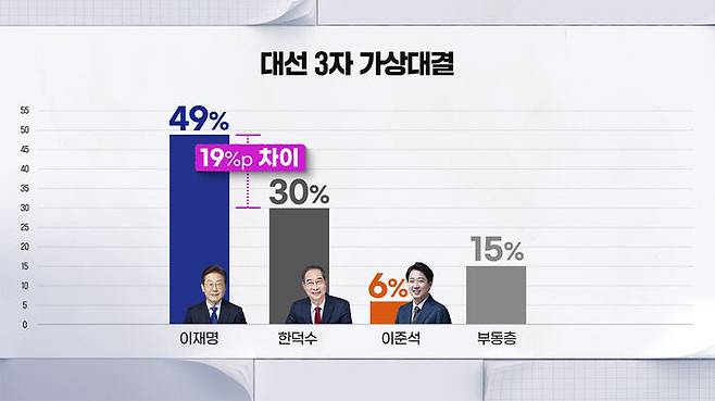 김 후보를 한덕수 전 총리로 바꿔서 3자 가상 대결을 조사한 경우엔, 이재명 49%, 한덕수 30%, 이준석 6%로 나타났습니다.