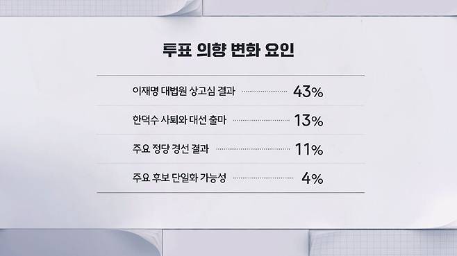 '이재명 민주당 대선 후보에 대한 대법원 상고심 결과' 43%, '한덕수 전 대통령 권한대행의 사퇴와 대선 출마' 13%, '주요 정당의 당내 대선 경선 결과' 11%, '주요 대선 후보들의 단일화 가능성' 4%였습니다.