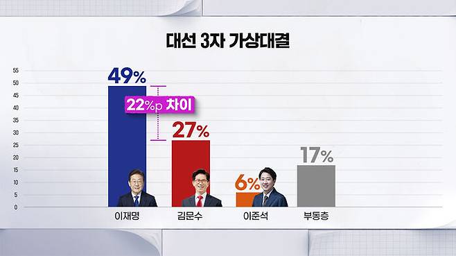 이재명 민주당 대선 후보와 김문수 국민의힘 대선 후보, 이준석 개혁신당 대선 후보가 가상 대결하는 경우, 이재명 49%, 김문수 27%, 이준석 6%로 조사됐습니다.