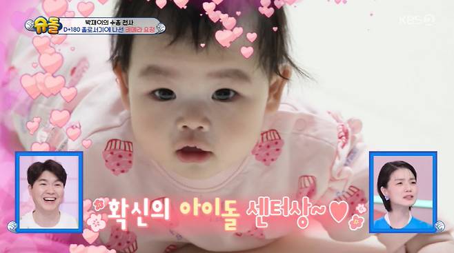 백일에 첫 스튜디오 촬영 때도 카메라를 찾았던 재이. 박수홍은 우혜림에 "재이 걸그룹 시켜도 될까요?"라 물었고 혜림은 "너무 재능이 있다. 저는 데뷔 초에 카메라를 못 찾아서 '제발 카메라를 봐줄래?' 그랬다"며 웃었다.