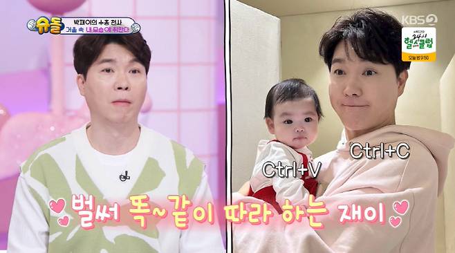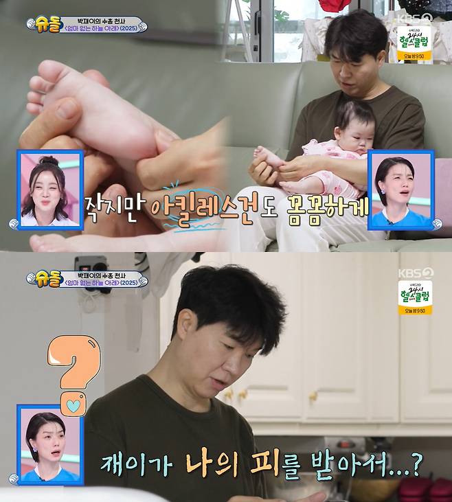 엄마가 없는 사이 박수홍은 딸 재이의 발 마사지를 해줬고 "발에서 분유냄새가 난다"라며 행복해 했다. 터미타임을 하는 재이를 두고 박수홍은 "아빠 약 좀 먹을게"라며 각종 영양제들을 입에 우르르 쏟아넣었다.