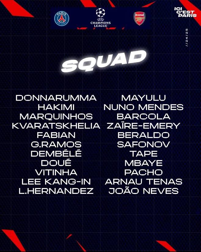 그런 상황이서 이강인도 일단 아스널과의 홈 경기에 나설 수 있는 명단에 등록됐다. PSG는 7일 오후 22명의 아스널전 스쿼드를 발표했는데 이강인이 이름을 올렸다.