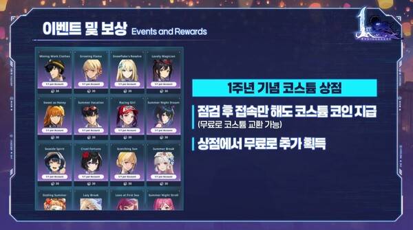 점검 후 접속만 해도 코스튬 코인을 지급하며, 1주년이니만큼 코스튬 한 개는 무료로 교환할 수 있다. 업적에서 얻을 수 있는 명예 보상은 교환 불가능하다.