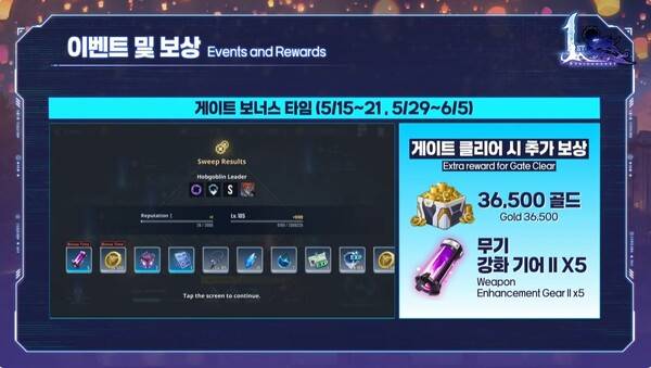 이벤트 기간 동안 게이트 클리어 시 36500 골드와 무기 강화 기어2 5개를 추가로 얻는다.