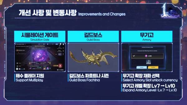 시뮬레이션 게이트 배수 플레이를 지원한다. 길드 보스 파흐트나 시즌이 시작된다. 무기고 확장 재화 선택이 가능하며, 무기고 레벨이 10레벨로 상승한다.