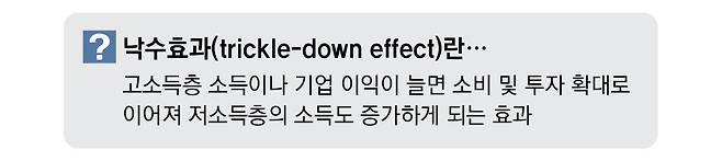 정치권에서 부유층 대상 감세정책 논의가 시작될 때면 어김없이 등장하는 단어가 있다. 바로 ‘낙수효과(trickle-down effect)’다. 대기업의 이익이나 고소득층의 소득이 늘면 이들의 투자와 소비 증가를 통해 연관 부문으로 성과가 확산돼 결국 경제 전체가 성장한다는 주장이다. 하지만 실제 현실에서 작동하는지에 대해서는 오랫동안 치열한 논쟁이 이어져 왔다.》