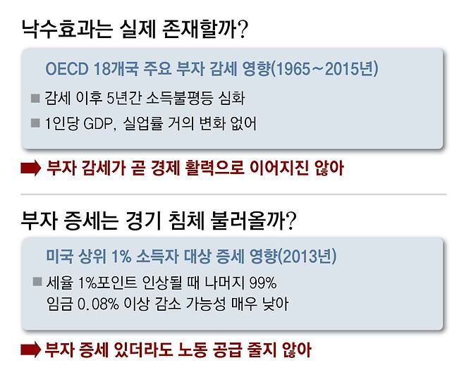 그렇다면 반대로 부유층 대상 증세는 다른 사회 구성원들에게 부정적인 영향을 미칠까? ‘부자 증세는 부자들의 근로 및 투자 의욕을 꺾어 경기 침체를 불러와 결국 부자가 아닌 사람들에게도 피해를 준다’는 주장 역시 낙수효과 논리와 맥을 같이하며 자주 등장한다.