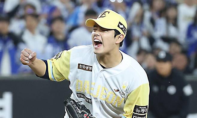 한화는 7일 대전 한화생명 볼파크에서 열린 2025 KBO리그 삼성과의 홈 경기에서 선발 문동주(사진)의 6이닝 2실점 호투와 경기 막판 폭발한 타선의 힘을 앞세워 10-6으로 승리했다. 지난달 26일 KT전부터 이어져온 연승 행진을 ‘9’로 늘린 한화는 시즌 성적 24승13패가 되며 이날 잠실에서 두산에 2-5로 패한 LG(23승14패)를 2위로 밀어내고 단독 선두로 올라섰다. LG는 올 시즌 처음으로 2위로 내려앉았다.
