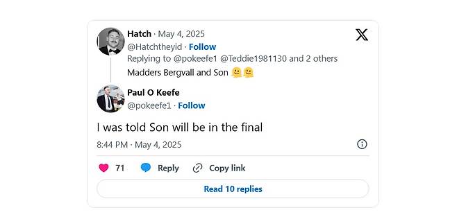 토트넘 소식에 정통한 풋볼 인사이더의 폴 오 키프 기자는 5월 4일 자신의 X를 통해 손흥민 부상 관련 질문에 “손흥민이 결승에 출전할 거라는 소식을 들었다”고 답했다. 이를 토트넘 홋스퍼 뉴스가 인용했다.