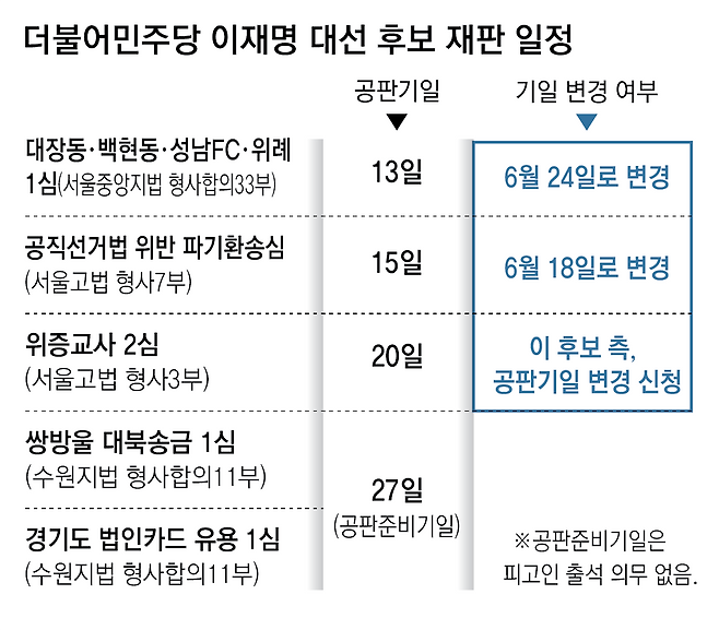 대법원이 1일 이 후보 사건을 유죄 취지로 파기환송하자 재판부는 2일 사건을 배당받고 바로 첫 공판을 15일로 지정했다. 곧이어 재판부가 소환장 송달까지 시도하자 민주당에선 대선 전 판결이 나올 수도 있다는 위기감이 돌았다. 연휴 등으로 송달은 7일까지 이뤄지지 않았고, 이 후보 측은 이날 오전 공판기일 변경신청서를 냈다.