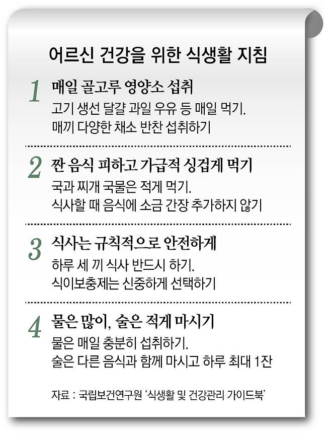 한국영양학회 ‘2020 한국인 영양소 섭취기준 개정 및 활용 연구’에 따르면 노년층은 단백질, 칼슘 등의 주요 영양소를 평균 필요량보다 적게 섭취하는 것으로 나타났다. 단백질 섭취를 위해 남성은 고기, 생선, 달걀, 콩류 등을 하루 4번, 여성은 하루 3번 섭취할 것이 권고된다. 칼슘 보충을 위해 우유나 두유를 하루에 한 컵 이상 마시는 것도 필요하다. 김치를 제외한 채소를 끼니마다 한두 가지씩 섭취하고, 제철 과일도 매일 챙겨 먹는 것이 좋다.