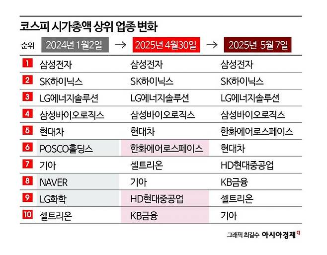 유가증권시장(코스피) 시가총액 순위에 또 한 번 지각변동이 일어났다. 도널드 트럼프 미국 대통령 취임 이후 외국인 순매수 1위 타이틀을 놓치지 않고 있는 한화에어로스페이스가 기아에 이어 이번엔 현대차마저 제치면서 시총 5위로 올라섰다.