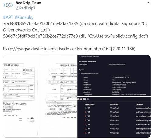 이런 가운데 중국 보안기업 레드드립팀은 김수키가 탈취한 CJ 올리브네트웍스 전자서명 정보를 악용해 국책연구기관인 '한국기계연구원'을 공격하려 했다는 정황도 공개했습니다.