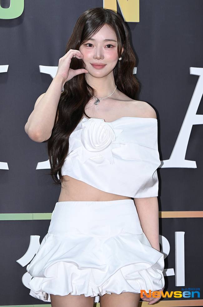 이날 이시안은 어깨를 과감하게 드러낸 화이트 오프숄더 크롭 블라우스에 짧은 미니스커트를 입고 날씬한 몸매를 드러냈다.