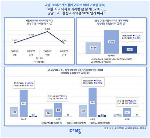 부동산 정보 플랫폼 다방이 오늘(8일) 국토교통부 실거래가를 분석한 결과, 서울 아파트 거래량은 1월 3천427건, 2월 6천462건, 3월 9천675건으로 올해 들어 지속적으로 증가하다가 4월에는 3천191건로 전월 대비 67% 급감했습니다.
