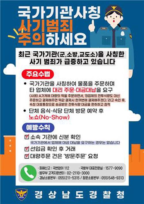 김성희 경남경찰청장은 "국가기관에서 업체에 대금 대납을 요구하는 경우는 없다"며 "의심스러운 전화를 받으면 해당 기관에 문의하거나 피해 발생 시 즉시 112에 신고해달라"고 당부했습니다.